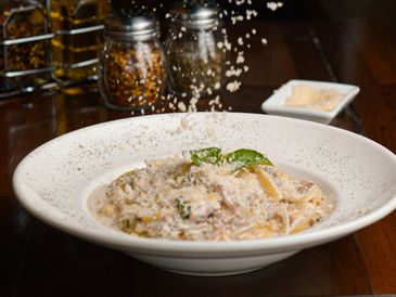 Fetuccini, pollo salteado, cebolla, ajo rostizado, panceta, albahaca fresca, salsa Alfredo y queso parmesano.