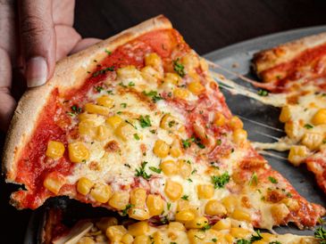 Champiñones, berenjena, pimiento rostizado, maíz, pomodoro y mozzarella.